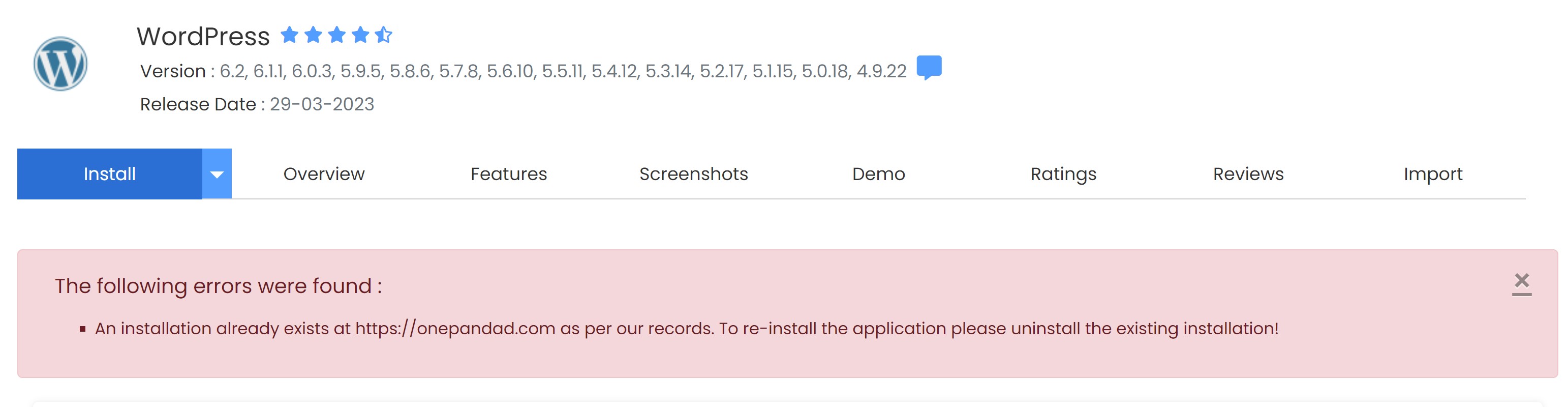 Installing software for your web site is made easy using cPanel and the Softaculous software. However, the folder you choose to install software must be empty for this to work. If you attempt to install software in a folder that is not empty, you may see the following error: